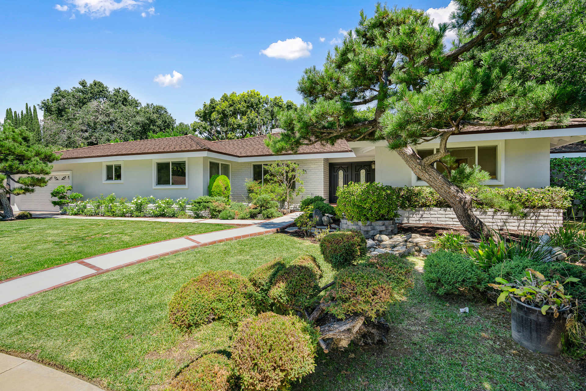 Welcome to this beautiful, 1,529 square foot, 1954 Mid-Century Ranch, with Asian influences, all sited on a deep 16,624 square foot Zen-like lot, in the sought-after country club neighborhood of Altadena. You enter the sunlit residence, with a desirable open floor plan, via the inviting foyer that has gleaming hardwood floors and a raised, original period planter. From there you step into the spacious living room with custom built-ins, a stately decorative, stone fireplace as well as expansive, tall sliding glass doors. This all adjoins the central dining room, with a corner banquet, that leads to the sun-dappled kitchen with an antique range and crisp white cabinetry.