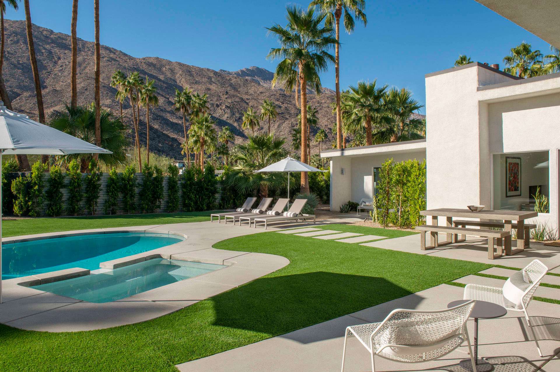 Welcome to Casa di Luce, located in the prestigious southwest Palm Springs neighborhood, The Mesa. This recently renovated 1960’s modernist home features picturesque, unobstructed views of the San Jacinto mountains just beyond its lush, resort-like grounds. The home is located on a private corner lot at the start of a cul-de-sac of notable MCM homes. Original exterior mid-century features include a breeze block garden wall and a cantilevered stone carport. Meticulously restored both inside and out, with a professional eye towards creating an easy, gracious and chic desert lifestyle oasis. A welcoming entry space provides a transition into the lofty living room centered around a floating hearth. This grand social space features exposed beams and new, large sliding glass doors that open onto the incredible outdoor space. The adjacent dining area connects to the fully equipped kitchen with eat-in counter, and opens onto a side yard garden with gas grill and seating for pre-dinner cocktails. The social spaces are anchored in the center of an L-shaped layout, with the master suite in one wing and two additional bedrooms with a shared bath and laundry in the other wing. The master suite contains an updated bath with dual vanities, a walk in shower with access to the pool, and a large walk-in closet. Adjacent to the master suite you will find a dedicated work space for two with abundant storage. Outside, the ficus hedges provide a green, privacy border around the entire perimeter of the property, which features a newly renovated pool, spa, fire pit, outdoor shower, retractable awning, and eco-friendly turf and desert landscape throughout. Towering, manicured palm trees and the desert mountains beyond provide the ideal backdrop for this mid-century modern Palm Springs home. The property is being sold stylishly furnished and well-equipped per inventory and has been a successful short-term rental property for over a year. Everything you need, all in one place. Only at Casa di Luce.