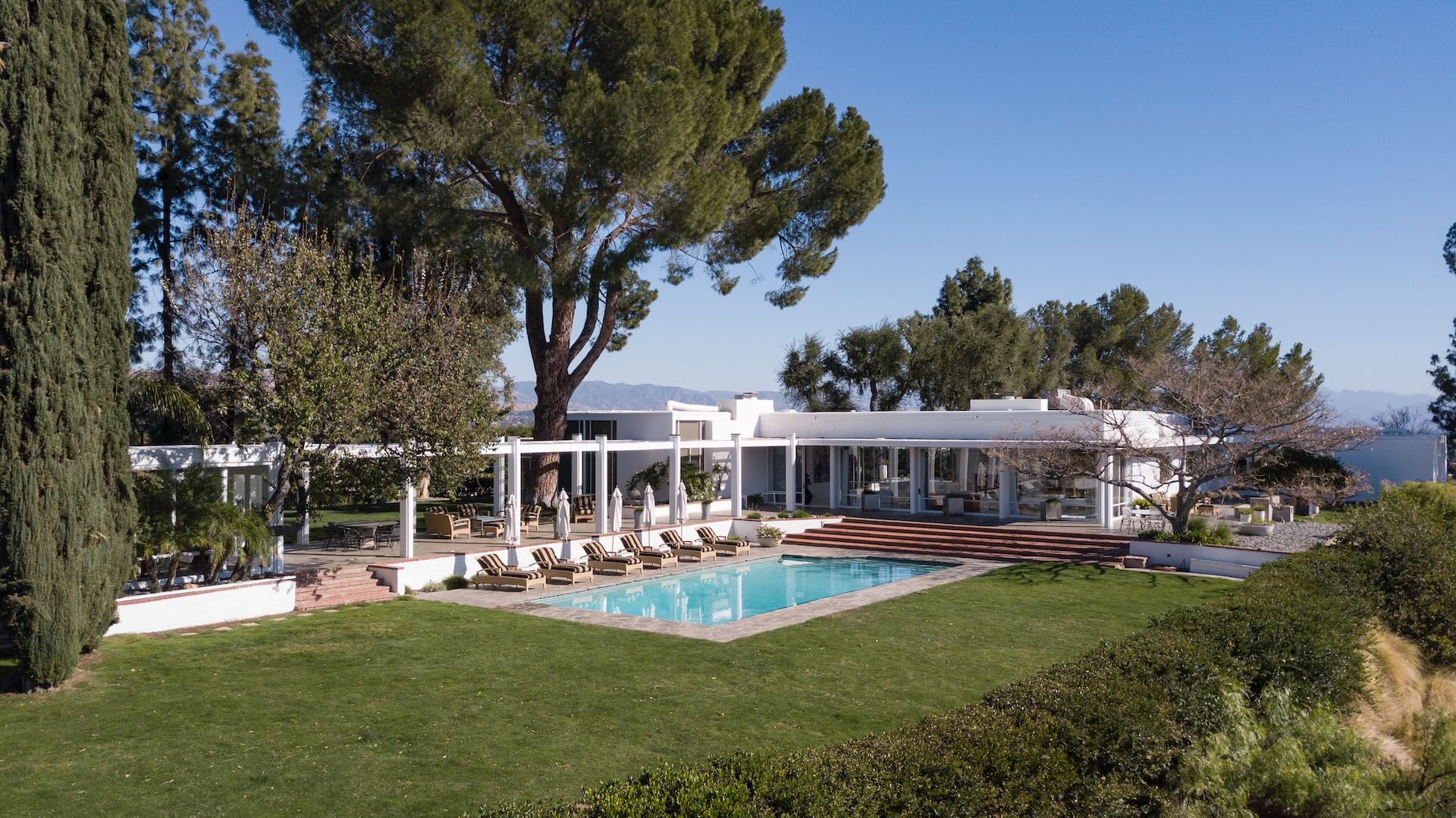 A half-mile proprietary road sweeps you up to the private restored masterpiece of glass-walled pavilions seamlessly embracing the almost 4 flat acres of pine-studded grounds and the panorama of the 1,325-acre meadowlands of Lake Chatsworth nature preserve. Beyond, the Santa Monica, Santa Susanna, Verdugo, and San Gabriel Mountains frame the 360-degree view of the communities of West Hills, Hidden Hills, and Calabasas and all the way to Universal Studios. A broad ambulatory leads guests to the center pavilion revealing the major proportions of the residence with its 16-foot ceilings, luminous white walls, and floors. This entry gallery leads them directly through giant sliding doors to the 50-foot pool, lounge terrace, and the pergola. Flanking the entry pavilion are the grand parlor or living room with zebra cork floors and a separate master suite and wing. The dining room, kitchen, and three ensuite bedrooms with sitting room comprise the westerly structure. The arcaded pergola, a modern cloister, directs one to the pool house/cabana/gym. Either of two walkways meander to the sequestered one-bedroom guest house with its own pool.The complex totals five bedrooms, six and a half baths, and two kitchens with approximately 15 acres of grounds and a huge motor court. Ripe for equestrian retreat, vineyard, or tract map potential on part of property. The residence, guest house and pool are replete with Hollywood lore, from Francis Lederer, Judy Garland, Lucille Ball, Sinatra, Monroe, and a lore that continues with the site's vaunted film/video locations. More than his masterpiece, this property may be Pereira's culmination of residential design. It is truly a "One Of A Kind" home.