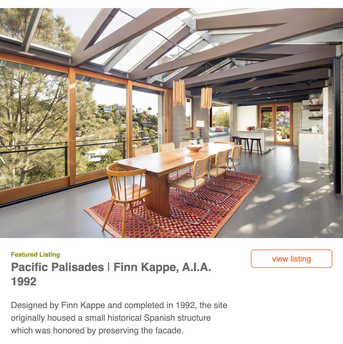 The 1948 three-bedroom house has French doors, vaulted beamed ceilings, and a glass dining atrium.